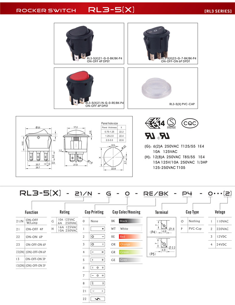 21/N:4pin on-off w/lamp,21: 4pin on-off,22: 6pin on-on,23: 6pin on-off-on,23(on): 6pin (on)-off-on